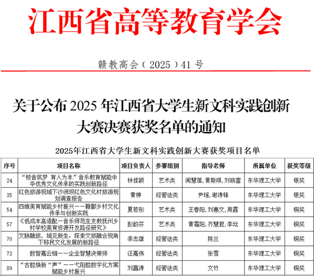 近日,由省教育厅指导,省高等教育学会主办的2025年江西省大学生新文科实践创新大赛结果揭晓,东华理工大学推选的11个项目共获银奖2项、铜奖5项,学校获评“优秀组织奖”。