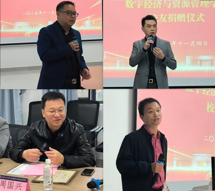 11月4日,数字经济与资源管理学院在青岚校园综合楼314会议室举行了2025年度校友捐赠仪式。2001届会计学专业校友广州金恺财务咨询有限公司总经理周国兴、上海思恒维供应链有限公司总经理叶靖枢、2007届财务管理专业校友南京龙梅电子商务有限公司总经理王振龙、广州友宝家具有限公司总经理曹俊平四位校友出席。东华理工大学教育发展基金会、资产与实验管理处、计划财务处等职能部门相关负责人,数字经济与资源管理学院党政班子和师生代表共计40余人参加捐赠仪式。仪式由学院副院长(牵头负责行政工作)赵玉主持。捐赠仪式前,校党委常委、副校长熊国保亲切会见了周国兴、叶靖枢、王振龙、曹俊平四位校友,代表学校对四位校友的慷慨捐赠表示感谢,希望校友们今后能够更加关心关注学校的发展,并诚挚邀请大家在明年七十周年校庆时再回母校,共续深厚情缘。