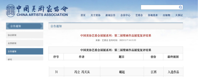 近日,中国美协艺委会届展系列第二届壁画作品展览复评结果公布。东华理工大学美术与设计学院冯立教授创作的壁画作品《崛起》成功入选。