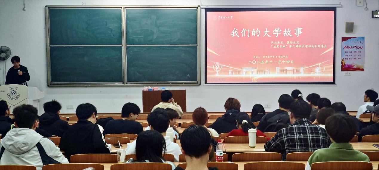 11月14日晚,“芯”翼互助第三期——“我们的大学故事”主题分享会在3号教学楼阶10与阶13教室同步举行。本次活动邀请2022级张子金、徐悦两位同学作为主讲嘉宾,围绕学业规划、竞赛科研、职业发展及个人成长等话题,与在场同学展开深入交流。