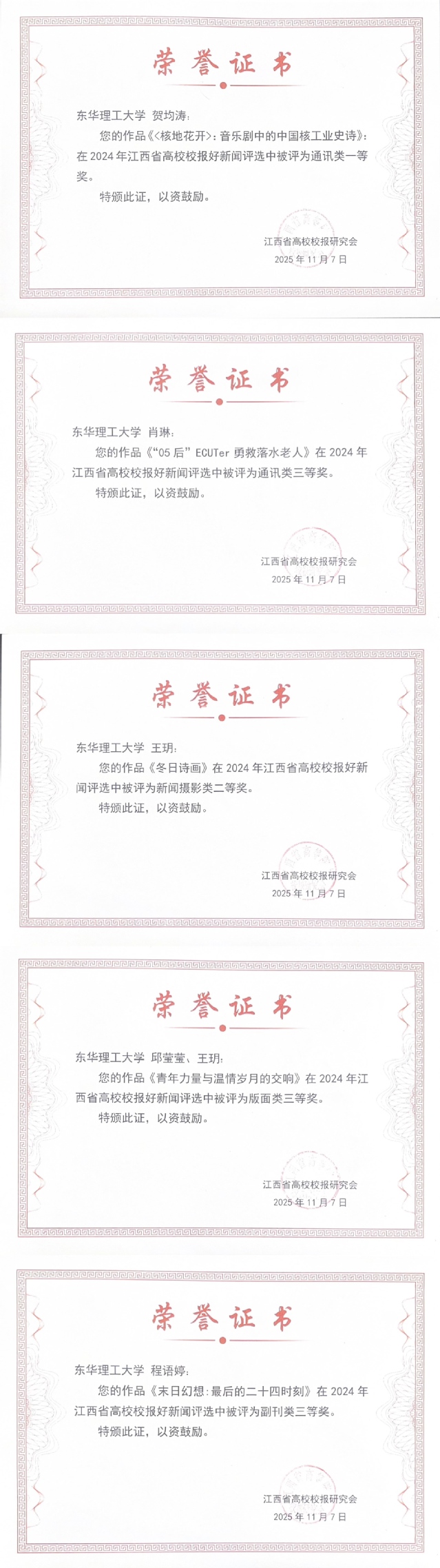 据悉,江西省高校校报好新闻评选活动由省高校校报研究会主办,是衡量全省高校校报业务水平的权威赛事。评选涵盖消息、通讯、评论、副刊、版面、新闻摄影、融合报道等七类项目,旨在展示高校校报年度成果,发挥优秀新闻作品的示范引领作用,推动高校新闻舆论工作高质量发展。(文/图 刘宇翔)