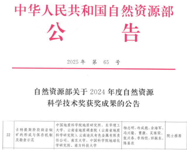 近日,自然资源部正式公布了2024年度自然资源科学技术奖获奖名单。由东华理工大学联合中国地质科学院地质研究所、云南省地质调查院(云南省地质科学研究院)、中国科学院地球化学研究所等6家单位共同申报完成的“古特提斯阶段斑岩铜矿的形成与保存机制及勘查示范”项目荣获一等奖。