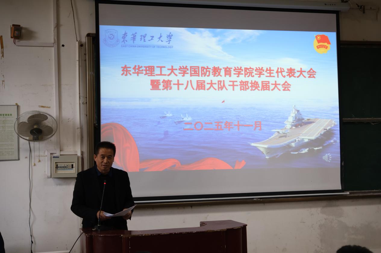 11月25日下午2时,国防教育学院在抚州学府校区信工楼阶六教室召开学生代表大会暨第十八届大队干部换届大会。学院党委书记赵克锋、组织员傅江辉、团委副书记郭佳磊、辅导员黄佳静、院第十七届大队干部及学生代表200余人参加此次大会。本次会议由郭佳磊主持。