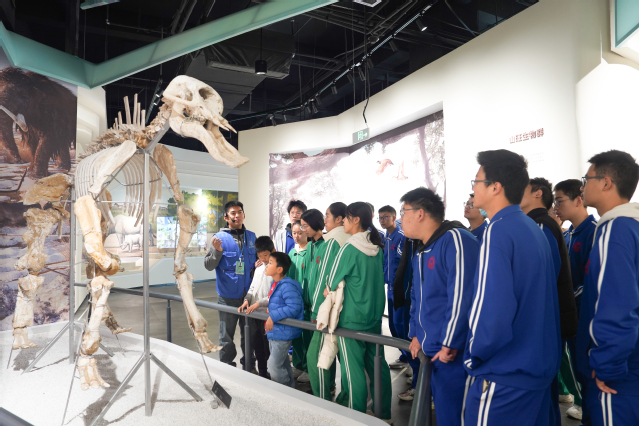 在地质博物馆中,师大附中学子跟随志愿者的讲解,开启了一场融合科学与精神的探访之旅。从丰富的矿产资源到珍贵的古生物化石,各类展品生动展现地球演化的壮阔历程。讲解员以“地质人在国家建设中的红色足迹与产业贡献”为主线,生动讲述一代代地质工作者“为国找矿”的使命担当,使同学们在增进科学认知的同时,深切感受到地质工作背后蕴含的家国情怀。