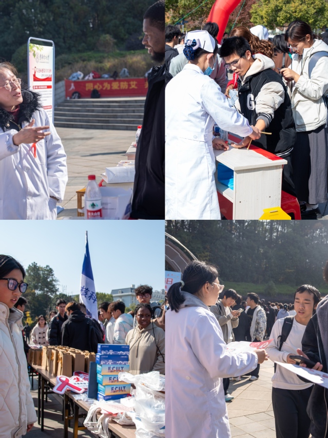 活动现场设置了宣传展台、有奖问答、心愿墙寄语、与“艾滋病患者”情景互动等多个环节,吸引众多师生驻足参与。现场还专门设立艾滋病与流感免费咨询检测点,由属地医院及校医院专业人员提供检测与健康指导,倡导“主动检测、知艾防艾”的健康责任意识。