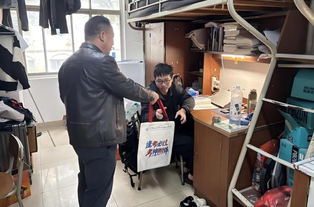 慰问现场,一份份精心筹备的“暖心加油包”被送到同学们手中。包里不仅有实用的中性笔、笔记本等学习文具,还有暖手宝、围巾等防寒保暖用品,每一件物品都饱含学院的细致考量,每一份礼物都承载着对学子们学业有成、前程似锦的殷切期盼。“注意身体,加油冲刺!”“相信自己,未来可期!”一声声暖心的叮咛,凝聚着师长对学子身心健康的深切挂念;一个个沉甸甸的包裹,传递着学院大家庭的温暖与力量,让寒冬里的备考寝室满溢温情,更让同学们备受鼓舞、倍感振奋。