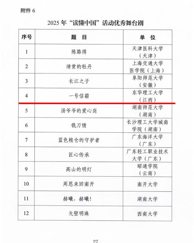 近日,教育部关心下一代工作委员会公布了2025年“读懂中国”活动评选结果。东华理工大学选送的作品——舞台剧《一号信箱》从全国高校众多参赛作品中脱颖而出,获评优秀舞台剧。