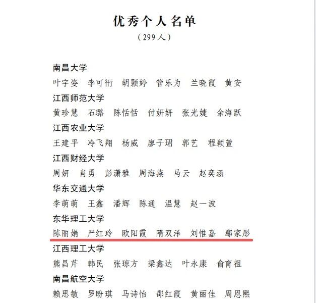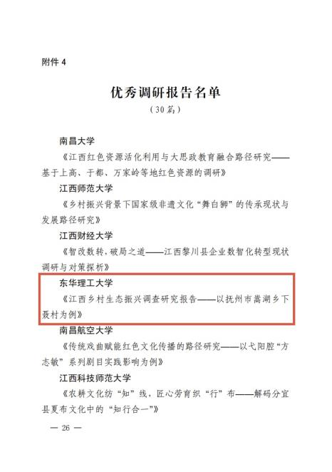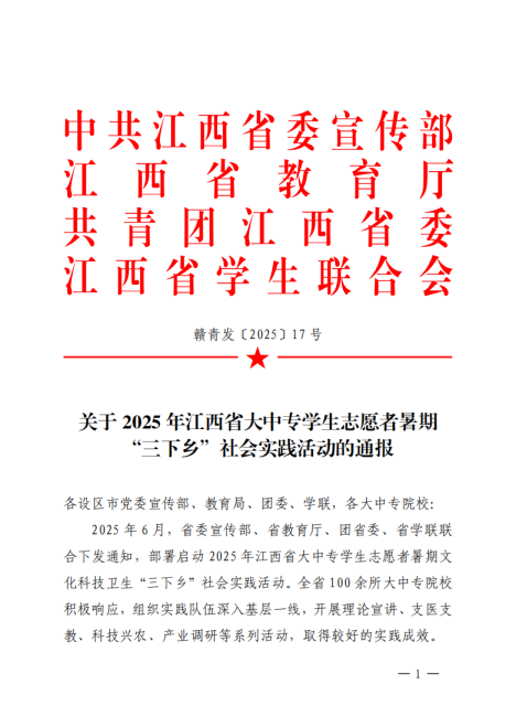 近日,省委宣传部、省教育厅、团省委、省学联联合下发《关于2025年江西省大中专学生志愿者暑期“三下乡”社会实践活动的通报》。通报中,表彰了本次活动的优秀实践成果,马克思主义学院选送的《江西乡村生态振兴调查研究报告——以抚州市嵩湖乡下聂村为例》(团队指导老师:华启和;团队成员:周依楠、薛迪、黎慧、刘锦菲)获2025年江西省大中专学生志愿者暑期“三下乡”社会实践活动优秀调研报告;学院党委副书记欧阳霞获优秀个人。