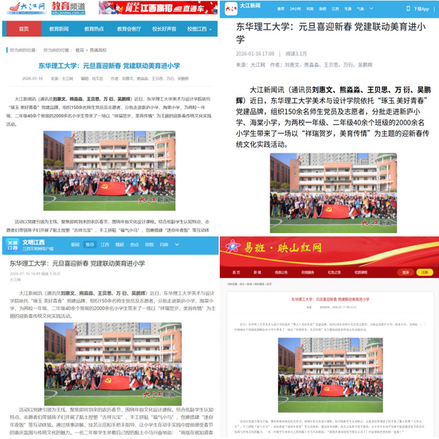 编者按:近日,东华理工大学美术与设计学院依托“琢玉·美好青春”党建品牌,组织150余名师生党员及志愿者,分批走进新庐小学、海棠小学,为学生带来迎新春传统文化实践活动。大江网、大江新闻、文明江西、映山红网等主流媒体对此进行报道,引发社会广泛关注。现将原文转载如下: