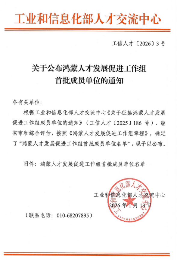 1月14日,工业和信息化部人才交流中心正式公布鸿蒙人才发展促进工作组首批成员单位名单,东华理工大学成功入选,成为江西省入选的少数本科高校之一,标志着学校在鸿蒙生态人才培养领域取得重要进展。