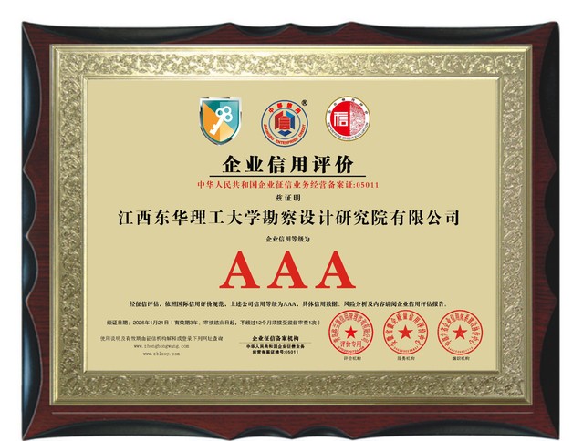 近日,经中部六省企业信用体系建设协作中心联合在中国人民银行征信业务备案的征信机构的严格评审,江西东华理工大学勘察设计研究院有限公司成功获批中部六省高质量发展企业“AAA级信用企业”证书,有效期至2028年,标志着公司在信用体系建设、合约履行能力及社会贡献三大核心领域获得权威认可。