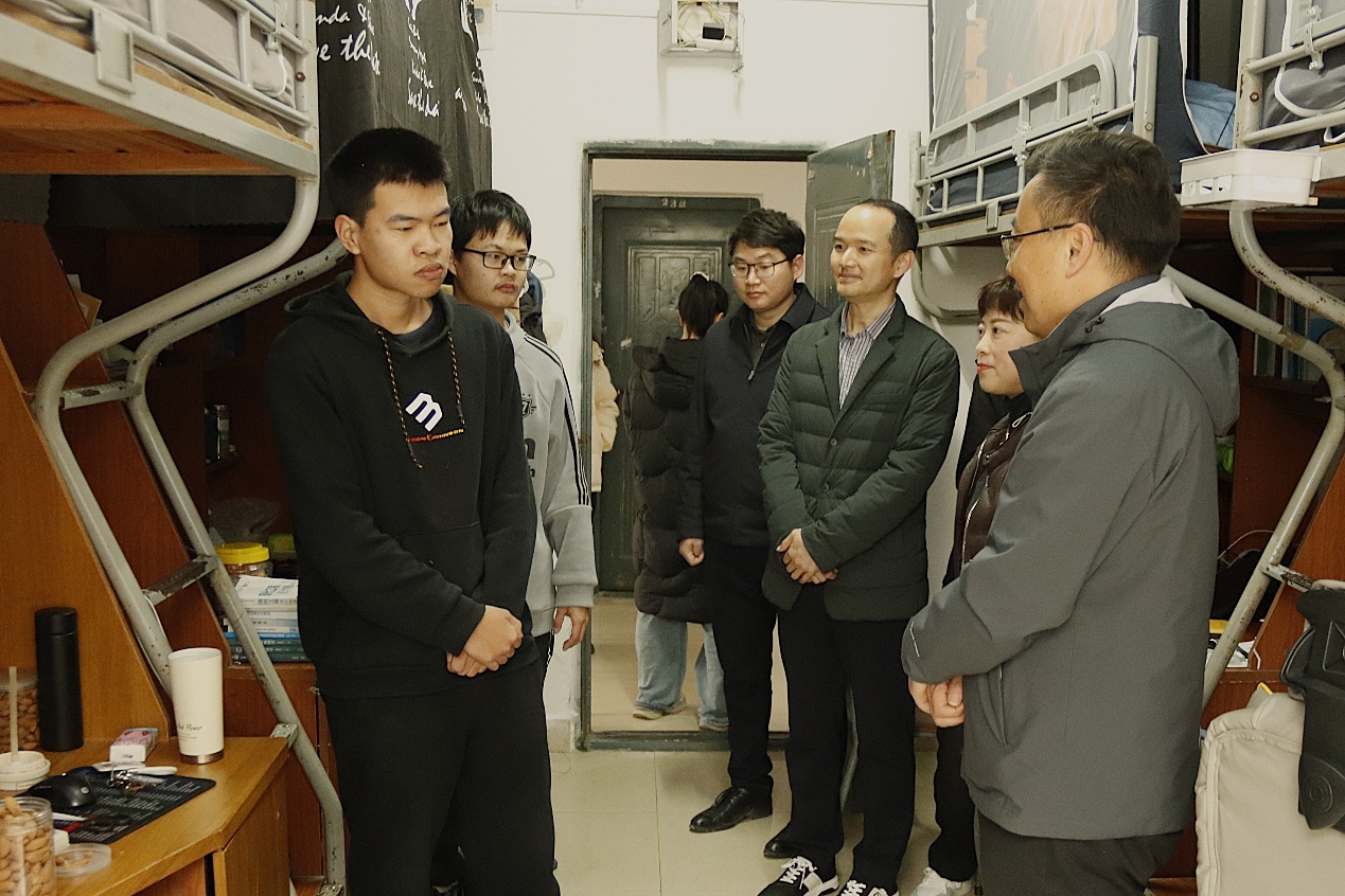 随后,学院领导带领全体辅导员走访学生宿舍,检查卫生内务与安全隐患,与学生交流学习适应、生活作息及学业规划,叮嘱互相关心、共建文明和谐宿舍。走访中,重点排查用电安全,加强思想引导,筑牢价值观根基;针对补考学生,耐心答疑解惑,提供复习建议,鼓励调整心态、查漏补缺、从容应考。