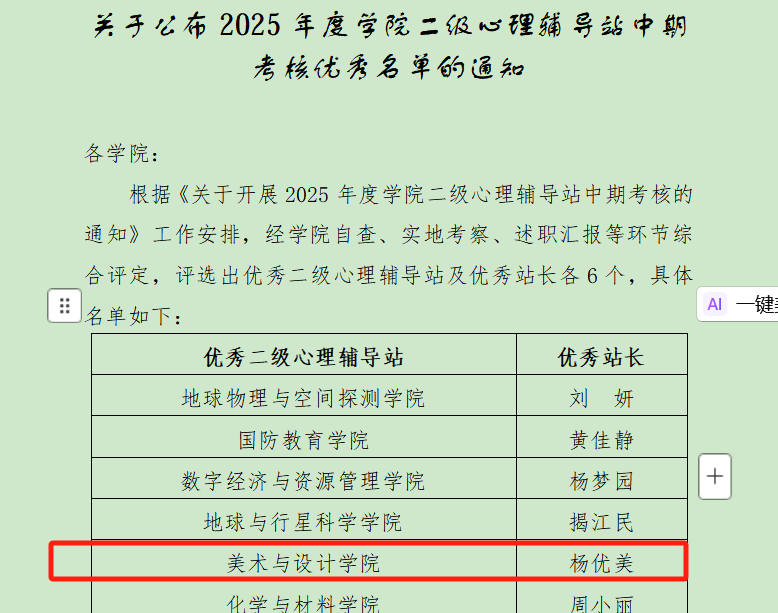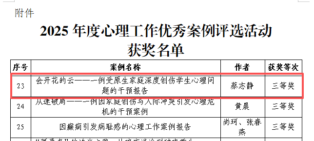 近日,学校2025年度心理工作优秀案例评选及二级心理辅导站中期考核结果正式公布,美术与设计学院凭借扎实的工作成效与突出的育人成果,斩获多项荣誉,学院二级心理辅导站获评优秀二级心理辅导站;学院心理辅导站站长杨优美老师获评优秀站长;蔡志静老师提交的《会开花的云——一例受原生家庭深度创伤学生心理问题的干预报告》案例荣获三等奖。以上成绩的获得,彰显了学院在心理健康教育领域的专业实力与责任担当。
