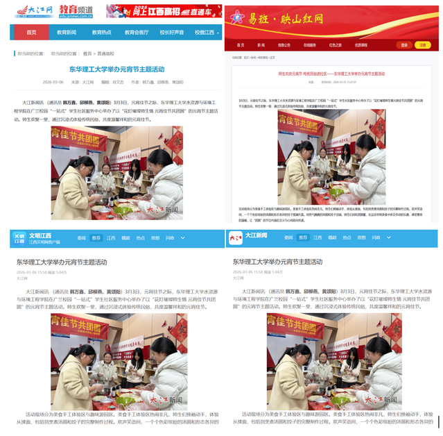编者按:3月3日,东华理工大学在广兰校园“一站式”学生社区服务中心举办元宵节主题活动,通过沉浸式体验传统民俗,共度温馨祥和的元宵佳节。大江网、大江新闻、文明江西、映山红网等主流媒体对此进行报道,引发社会广泛关注。现将原文转载如下: