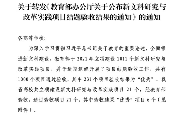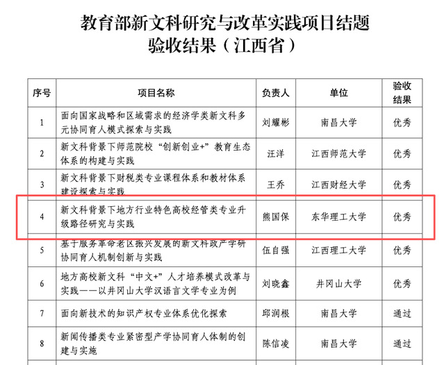 近日,教育部办公厅公布新文科研究与改革实践项目结题验收结果,我院熊国保教授主持的新文科背景下地方行业特色高校经管类专业升级路径研究与实践项目顺利通过验收,验收结果为优秀。