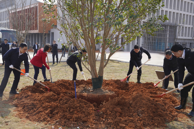 植树现场,处处是忙碌的身影。范小林、胡剑飞、王宏安、刘丽、张福庆等手持铁锹、踩着泥泞,来到植树点。大家一同挥锹挖坑、扶苗培土、围堰浇水,每道工序都一丝不苟。活动期间,市领导与校领导共同为当天栽植的一株抚州市市花——玉茗花(山茶花)悉心培土、浇灌,寓意校地合作如花绽放、历久弥香,也为即将迎来七十华诞的东华理工大学送上美好祝愿。