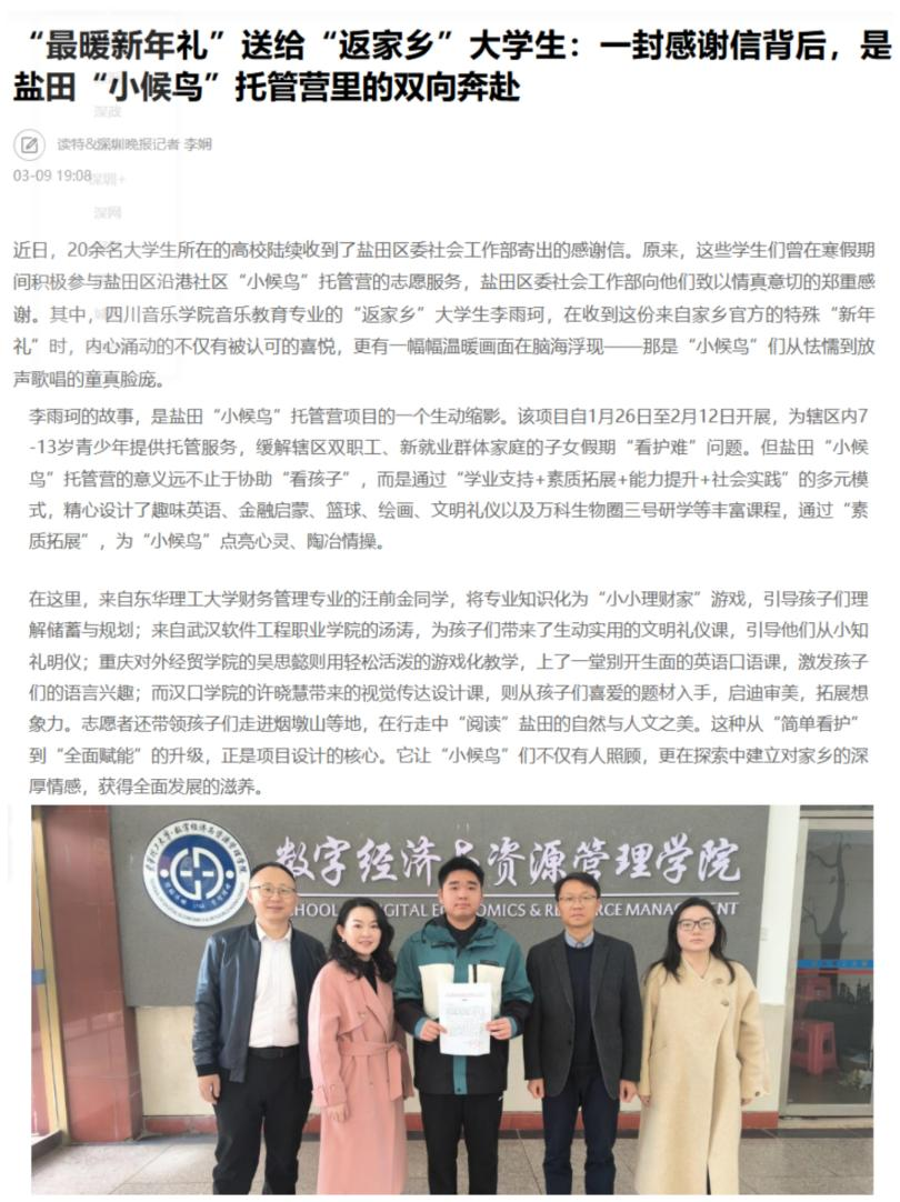 读特(深圳日报):《“最暖新年礼”送给“返家乡”大学生:一封感谢信背后,是盐田“小候鸟”托管营里的双向奔赴》