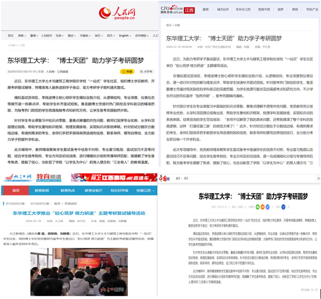 编者按:近日,东华理工大学土木与建筑工程学院在学校“一站式”学生社区,组织博士学历党员教师为备考学生推出以“砼心筑梦·核力研途”为主题的考研复试辅导活动人民网、国际在线、中国网、大江网等主流媒体对此进行报道,引发社会广泛关注。现将原文转载如下: