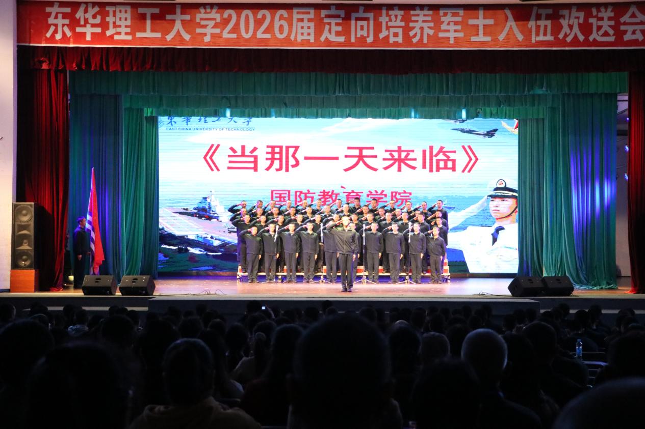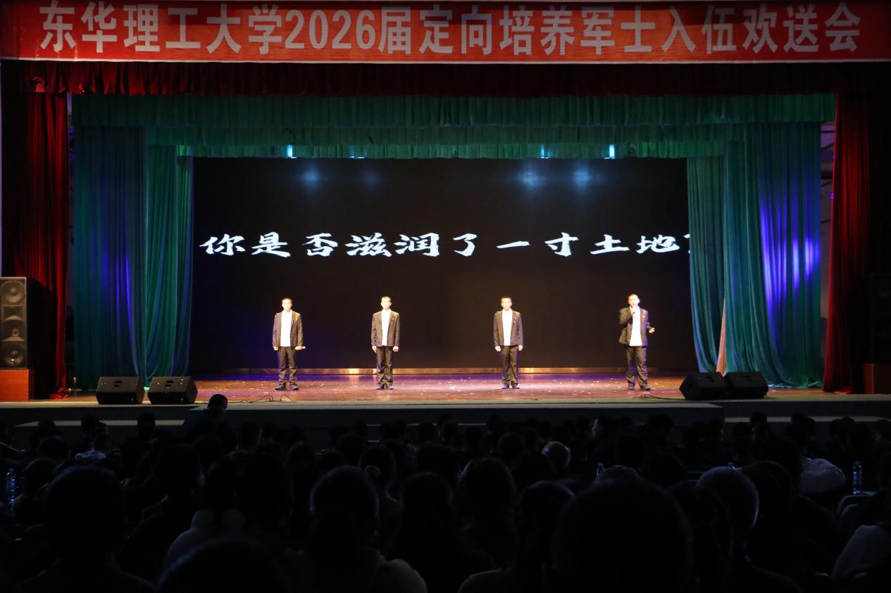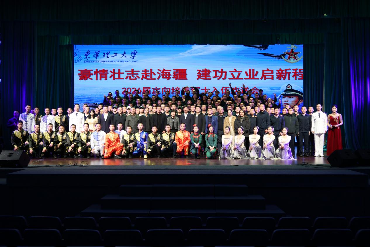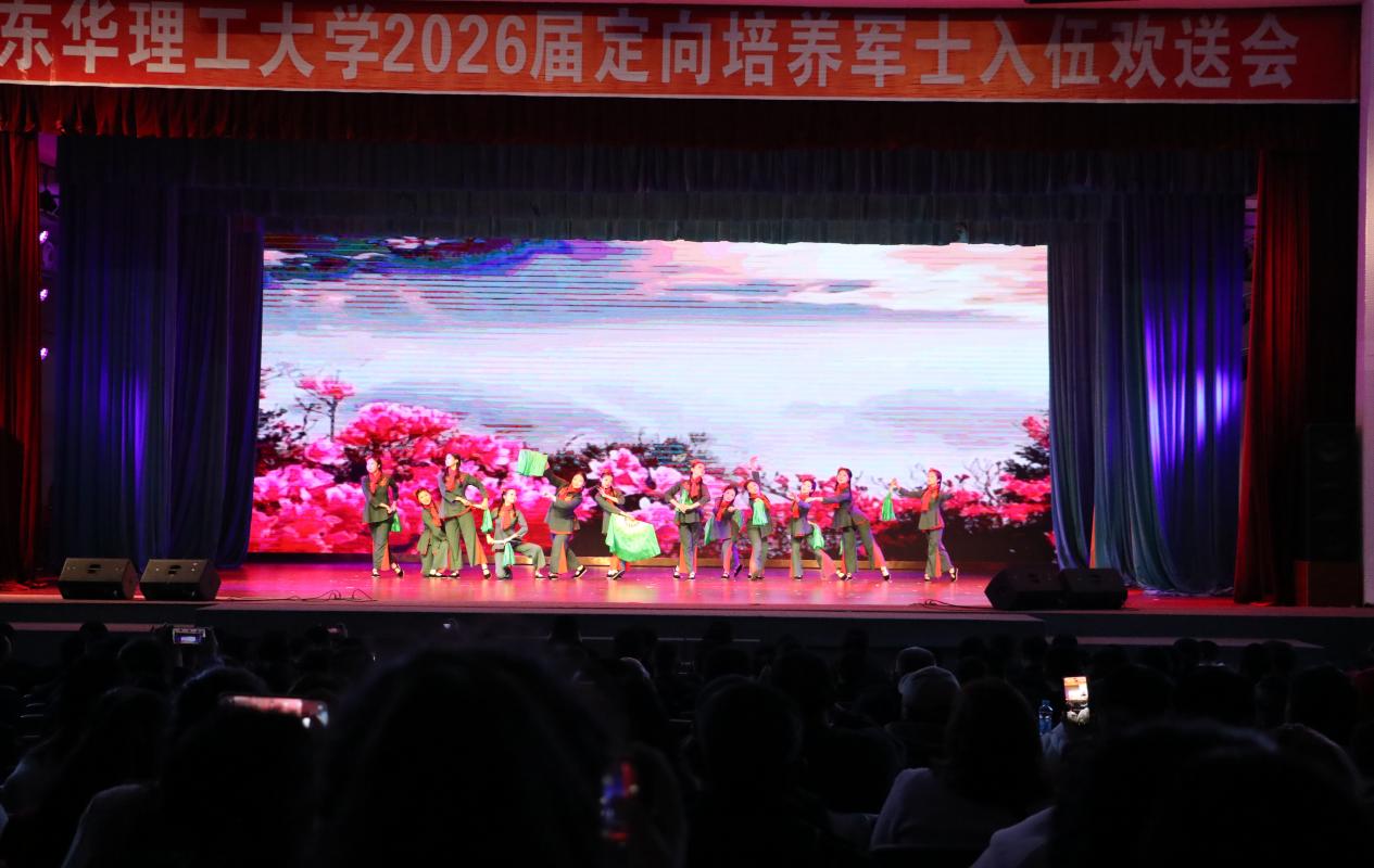 319日晚7时,国防教育学院在东华理工大学抚州校区学府校园大礼堂成功举办“豪情壮志赴海疆,建功立业启新程”2026届定向培养军士入伍欢送晚会。抚州校区党工委副书记、抚州校区管委会负责日常工作副主任江汶俊、国防教育学院党委书记赵克锋、院长吕开云、抚州校区管委会副主任黎军华、人民武装部副部长蓝贤桂、理学院党委副书记徐越男、校团委综合部部长李晶等,国防教育学院全体师生及2026届定向培养军士家长出席了欢送晚会。