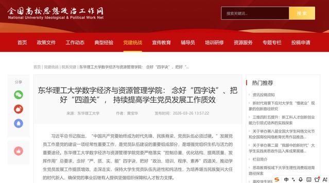 编者按:326日,全国高校思想政治工作网报道东华理工大学数字经济与资源管理学院念好“严、质、实、能”四字诀,把好“政治、培训、程序、素养”四道关,推动学生党员发展工作提质增效有关做法。现将相关报道转载如下: