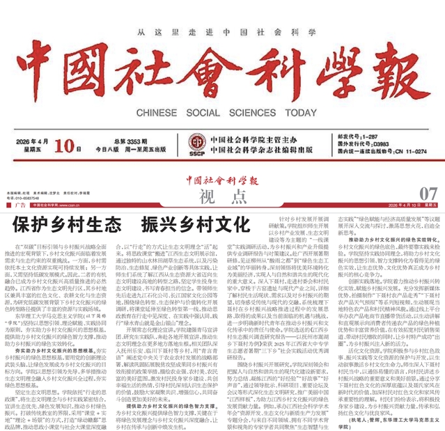 编者按:4月10日,《中国社会科学报》第7版刊载东华理工大学马克思主义学院副教授管辉署名文章《保护乡村生态 振兴乡村文化》,引发学界广泛关注。现将相关报道转载如下: