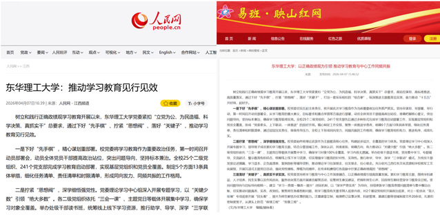 编者按:近日,东华理工大学党委紧扣“立党为公、为民造福、科学决策、真抓实干”总要求,通过下好“先手棋”、拧紧“思想阀”、落好“关键子”,纵深推进主题教育见实效。人民网、映山红网等主流媒体对此进行报道,引发社会广泛关注。现将原文转载如下: