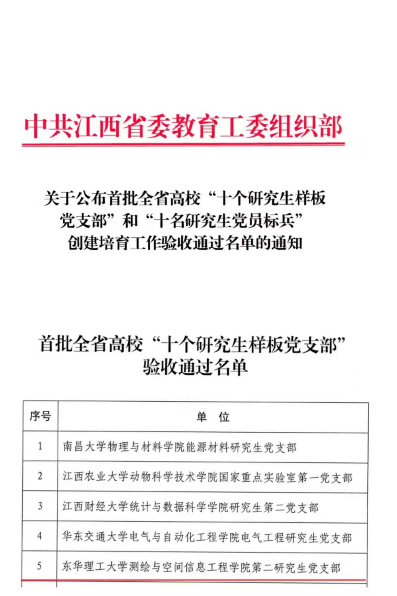 近日,江西省委教育工委公布首批全省高校十个研究生样板支部创建培育工作验收结果,测绘与空间信息工程学院第二研究生党支部凭借扎实的工作成效与鲜明的特色亮点,高标准通过验收。