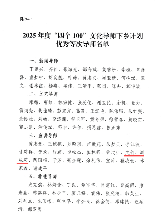 近日,中共江西省委宣传部通报2025年度“四个100”文化导师下乡计划优秀等次导师和优秀项目,我校文竹、周成莉2名教师入选优秀等次导师(宣讲导师)名单。