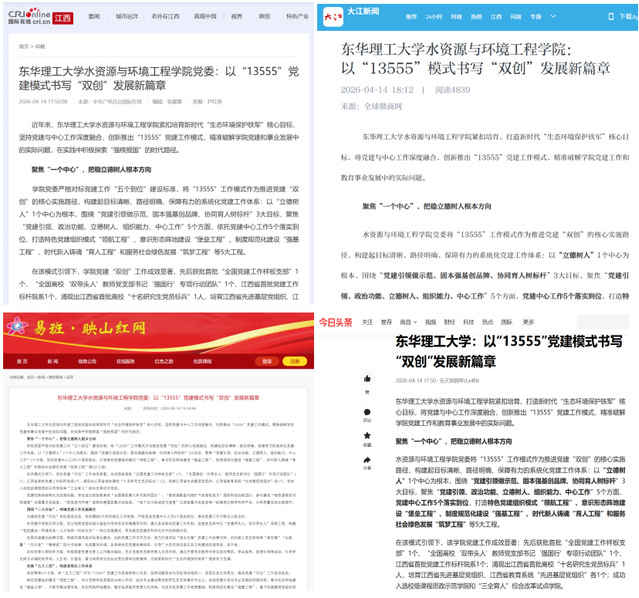 编者按:近日,东华理工大学水资源与环境工程学院紧扣培育新时代“生态环境保护铁军”核心目标,创新推出“13555”党建工作模式,精准破解学院党建和事业发展中的实际问题,在实践中积极探索“强核报国”的时代路径。国际在线、大江新闻、映山红网、今日头条等主流媒体对此进行报道,引发社会广泛关注。现将原文转载如下: