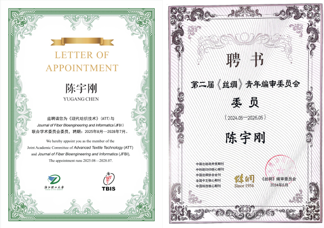 为共同推动纺织生物工程及信息学等领域的学术交流和知识传播,建设国际化期刊平台,近期《现代纺织技术》(ATT)与英国纺织领域重要学术期刊《Journal of Fiber Bioengineering and Informatics》(JFBI)联合组建ATT&JFBI中英双刊联合编委会,诚邀国内外相关领域专家、卓越学者加入联合编委会。经个人申请、编辑部初审、会议遴选及编委会审议等严格流程,该联合组织于近期公布了ATT&JFBI中英双刊首届联合编委会成员,我院陈宇刚教授继受聘CSCD核心、北大核心丝绸期刊青年编委之后再次成功受聘为联合学术委员会委员,同时担任两刊的编委或学术编辑
