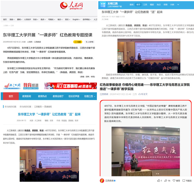编者按:4月7日至9日,东华理工大学马克思主义学院邀请江西干部学院教师易晗菲、江西方志敏干部学院特聘教授诸葛方林来校,开展“一课多师”红色教育专题授课。人民网、大江网、文明江西、江西思政等主流媒体对此进行报道,引发社会广泛关注。现将原文转载如下: