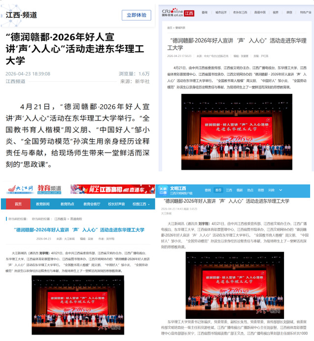 编者按:4月21日,由中共江西省委宣传部、江西省文明办主办,江西广播电视台、东华理工大学、江西省体育彩票管理中心、江西省图书馆承办,江西文明网协办的“德润赣鄱・2026年好人宣讲‘声’入人心”活动在东华理工大学大学举行。新华社客户端、国际在线、大江网、文明江西等主流媒体对此进行报道,引发社会广泛关注。现将原文转载如下: