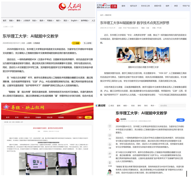 编者按:国际中文日期间,东华理工大学紧扣“中文:点亮多彩梦想”主题,精心策划多场融合传统与现代的语言文化体验活动。人民网、国际在线、映山红网、腾讯新闻等主流媒体对此进行报道,引发社会广泛关注。现将原文转载如下: