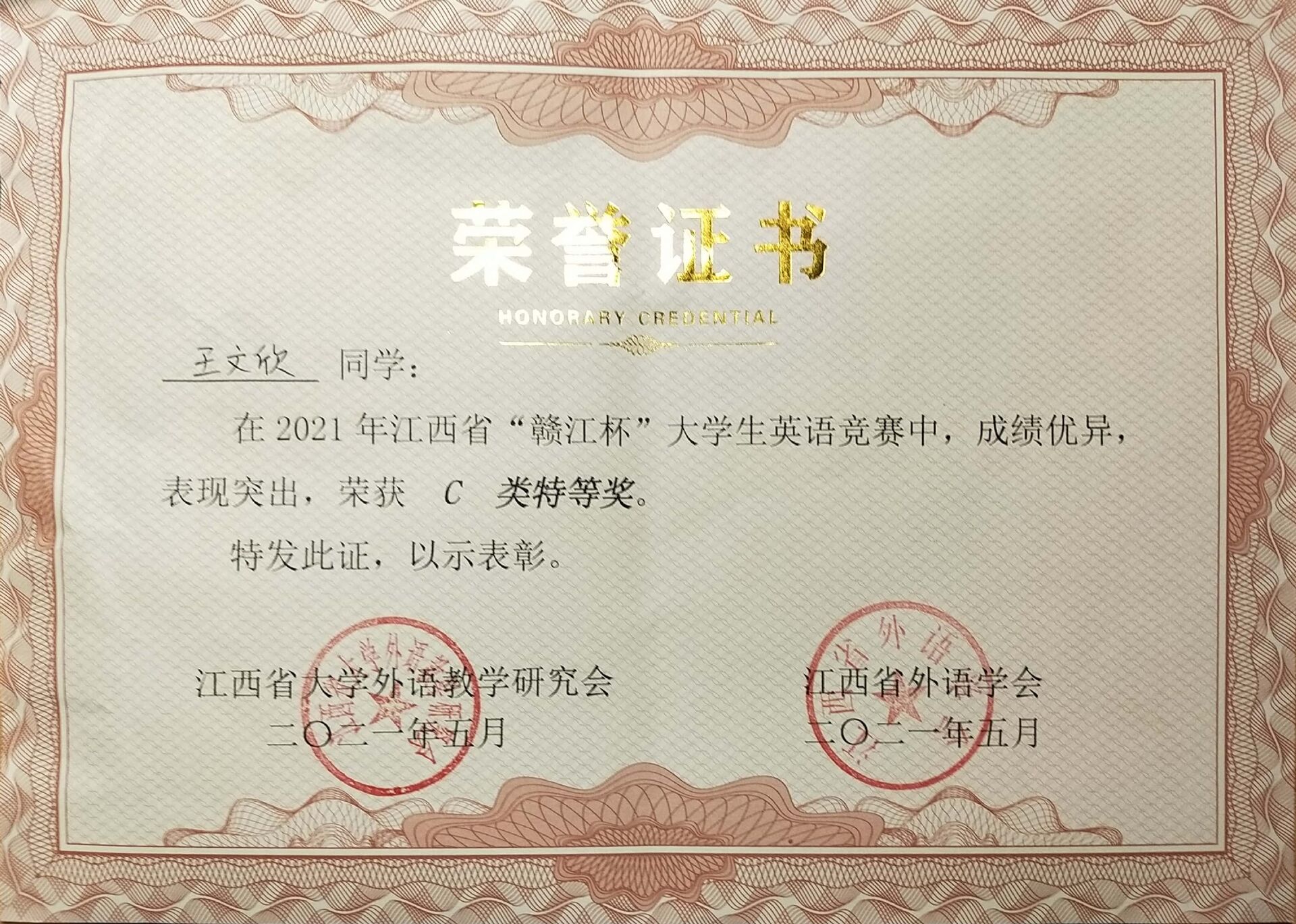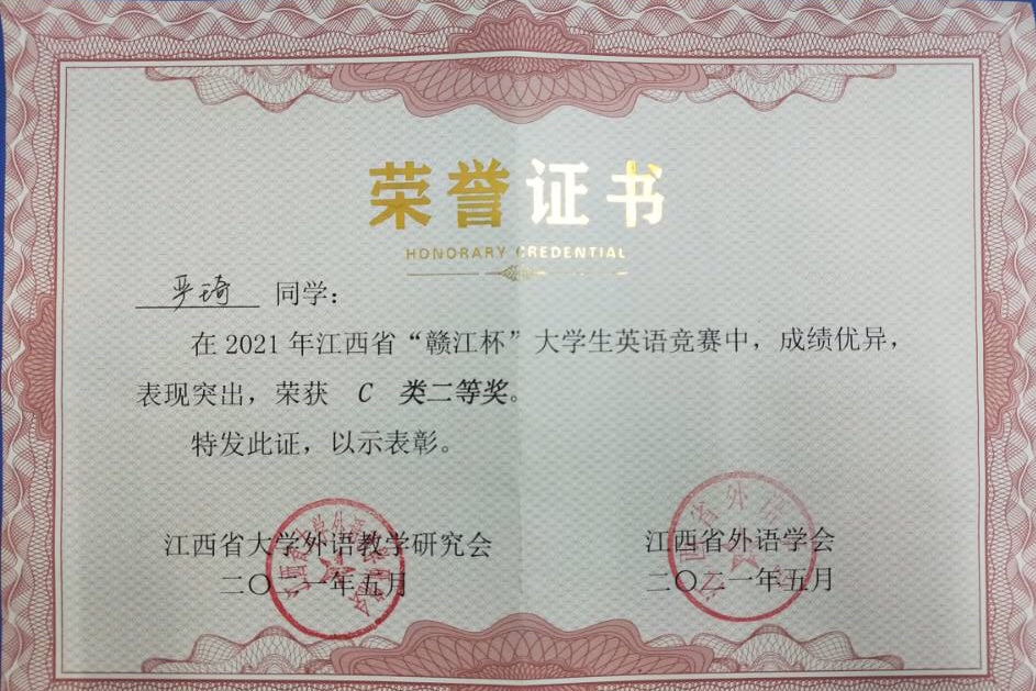 2021年5月16-17日,全国大学生英语竞赛决赛(江西赛区)暨“赣江杯”大学生英语竞赛在华东交通大学举行。来自全省50余所高校的近千名优秀选手参加了比赛。我院学子在本次比赛中发挥出色。其中,2018级财务管理专业王文欣同学荣获国家级特等奖和赣江杯综合类特等奖,2018级会计学专业严琦荣同学获赣江杯综合类二等奖。