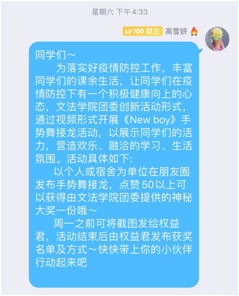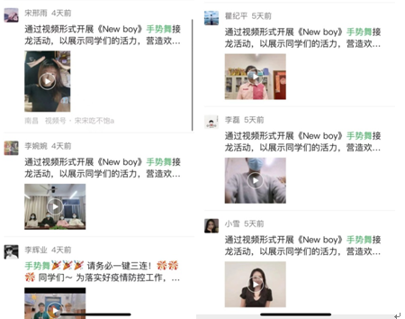 活动一经发出,就得到了广大文法学子的积极响应,全院师生纷纷参与进来,用舞蹈展现着自己对战胜疫情的决心和信念。截至今日,已收集百余份作品,活动发起人高雪妍老师表示,《New Boy》歌词中饱含着爱与希望,通过学生自主的积极情绪传递,希望可以缓解疫情当下大家的紧张心理,众志成城团结抗疫融入未来的希望之中。身体语言的表达治愈了学生们焦虑的情绪,即使在宿舍里也能享受到舞蹈和歌声带来的心灵舒畅。