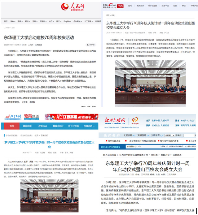 编者按:10月16日上午,东华理工大学70周年校庆倒计时一周年启动仪式暨山西校友会成立大会在学校创办地山西太谷举行。人民网、国际在线、大江网、江西文明网等主流媒体对此进行报道,引发社会广泛关注。现将原文转载如下: