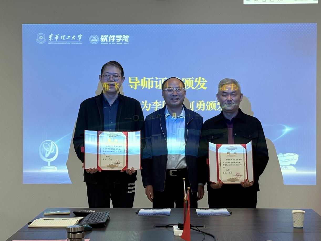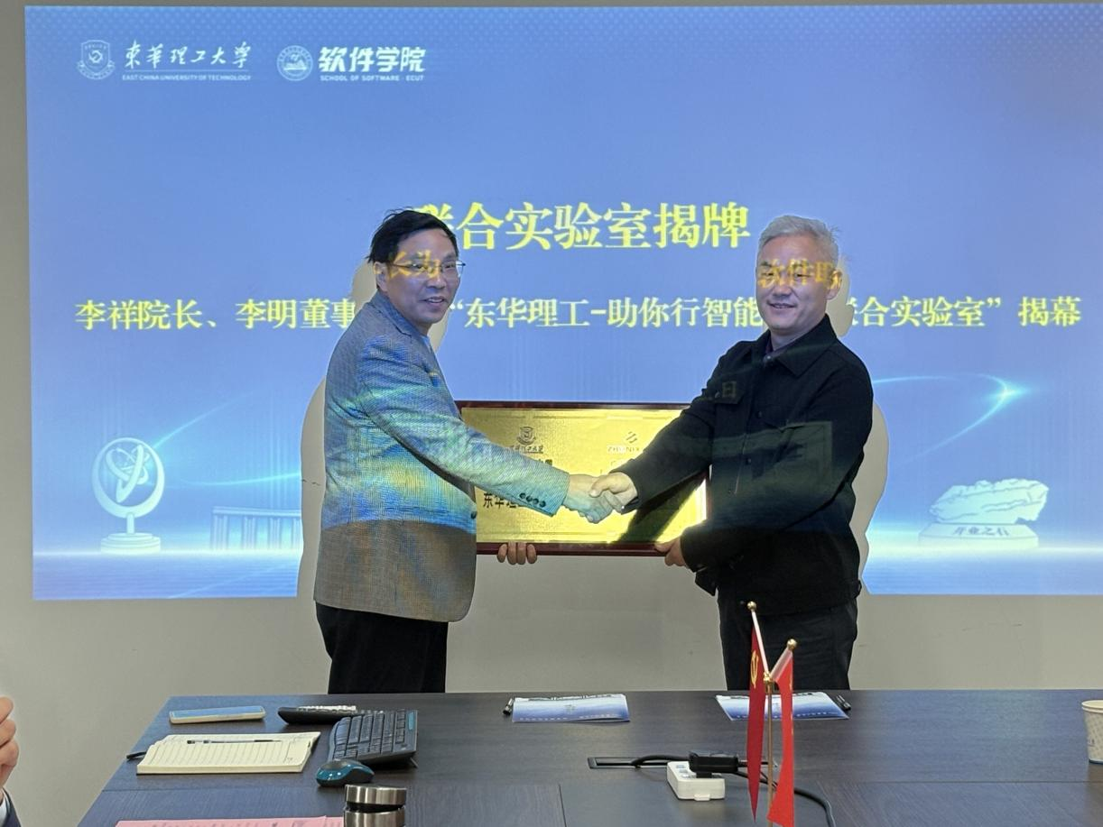 会上,江雁飞宣读《关于聘请李明、何勇为学院企业导师的决议》,并为二人颁发企业导师证书,为校企协同育人筑牢人才支撑。李祥与李明共同为“东华理工-助你行智能软件联合实验室”揭牌,标志着双方合作正式落地。