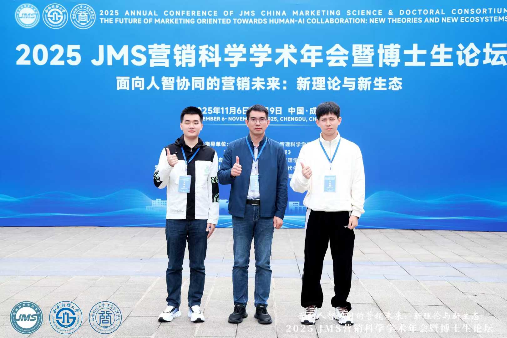 11月6日至9日,2025JMS营销科学学术年会暨博士生论坛在西南财经大学成功举办。本次会议聚焦“面向人智协同的营销未来:新理论与新生态”,旨在探讨人工智能与人类智能协同背景下营销科学的新范式、新理论与新生态。学院赵建彬教授、万德敏博士、硕士研究生邓俊龙参加此次会议。