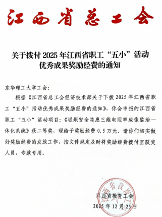 近日,江西省总工会公布了2025年全省职工“五小”活动优秀成果评选结果。东华理工大学地球物理与空间探测学院徐哈宁副教授申报的项目《堤坝安全隐患三维电阻率成像监治一体化系统》获二等奖,并获得专项奖励经费0.5万元。