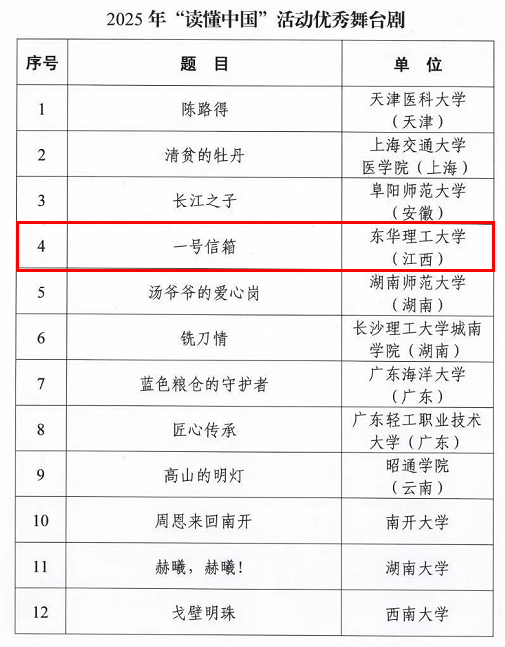 近日,教育部关心下一代工作委员会(教关委函[2025]15号)公布2025年“读懂中国”活动入选作品名单,东华理工大学选送的舞台剧《一号信箱》成功入选优秀舞台剧,是江西省2025年在该项活动中唯一一部入选的舞台剧,也是我校首次舞台剧作品入选。