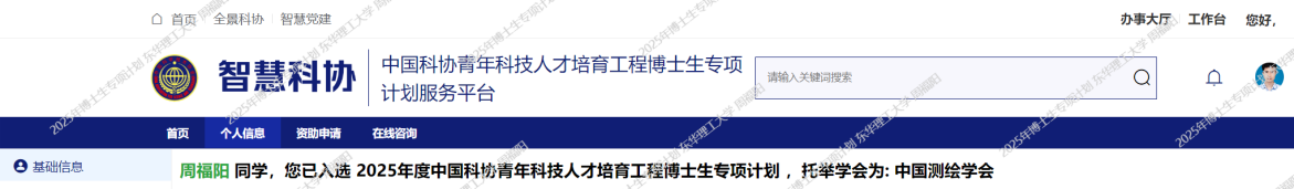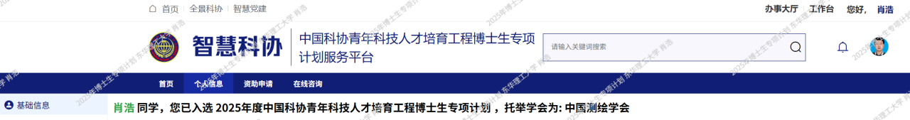 2025年12月,中国科学技术协会公布了2025年度青年人才托举工程博士生专项计划入选名单。测绘与空间信息工程学院周福阳、肖浩两位博士研究生成功入选。
