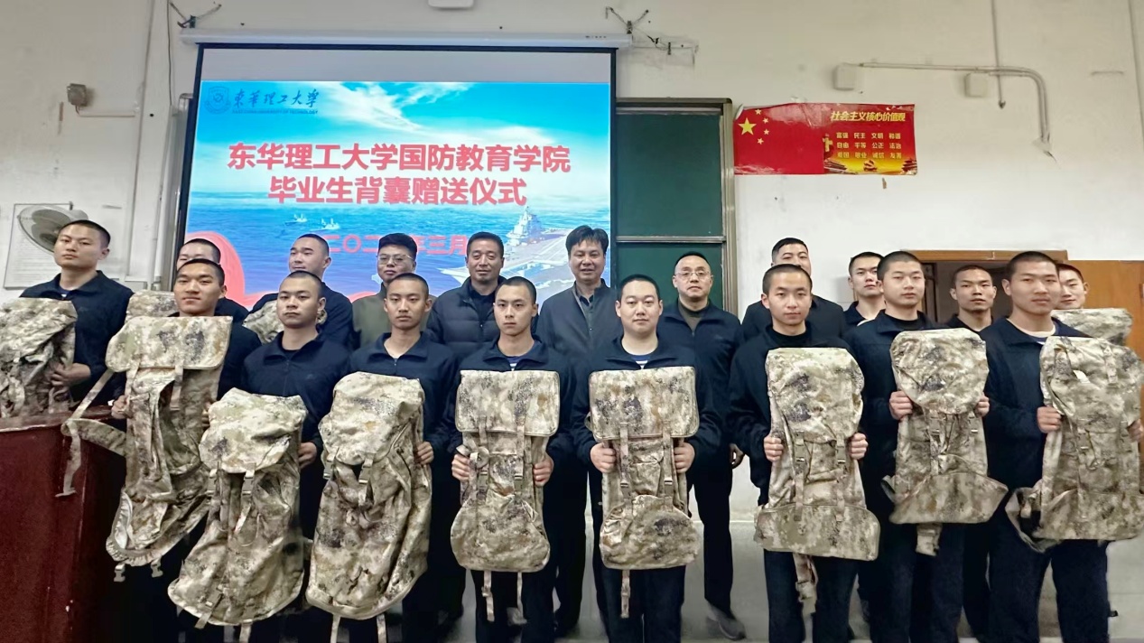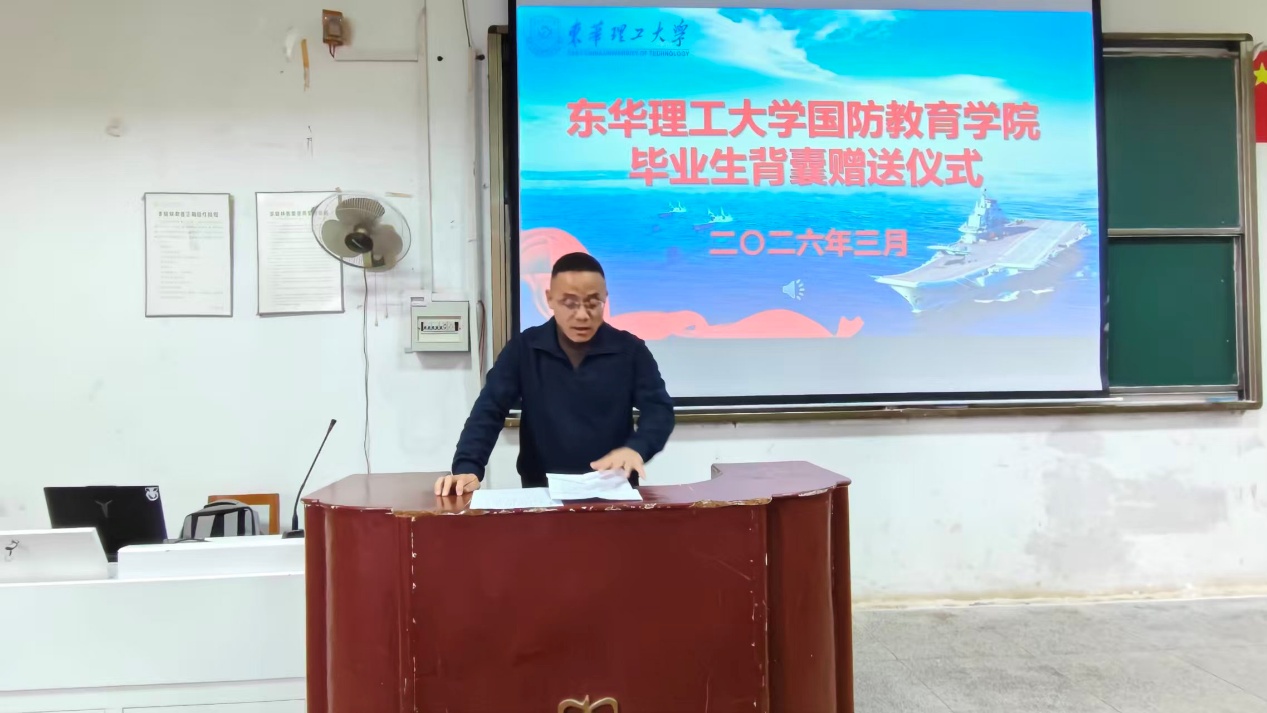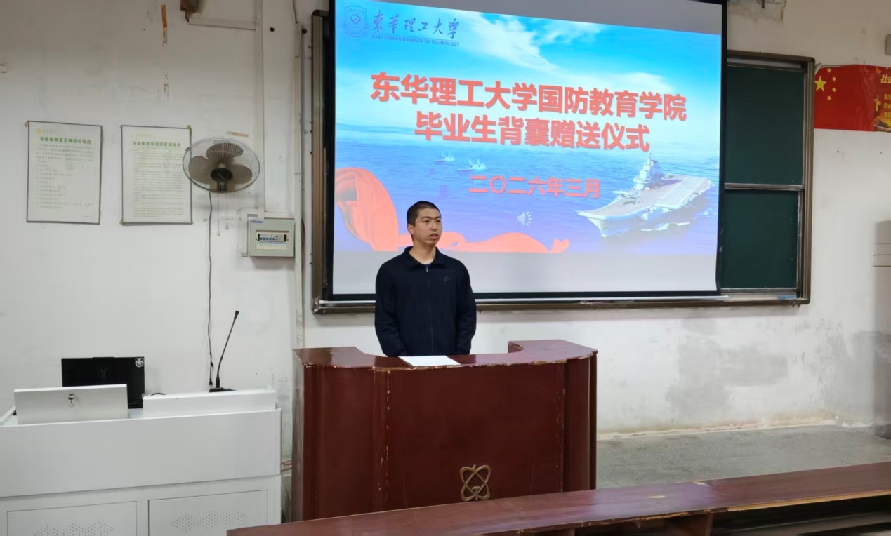 青春赴军旅,行囊载初心。为深化毕业生入伍前教育,凝聚青春强军力量,3月17日,国防教育学院在抚州校区学府校园信工楼阶六教室举行2026届定向培养军士毕业生背囊赠送仪式。学院党委书记赵克锋、党委副书记、院长吕开云、组织员兼26届毕业生班主任傅江辉、团委副书记郭佳磊、辅导员黄佳静及23中队全体定向培养军士参加此次仪式。赠送仪式由郭佳磊主持。