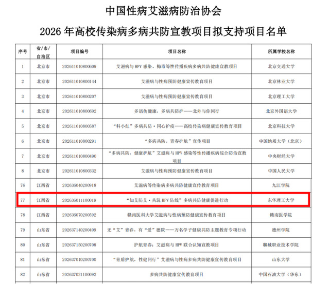 近日,中国性病艾滋病防治协会公布2026年高校传染病多病共防宣教项目立项结果。东华理工大学申报的《“知艾防艾·共筑HPV防线”多病共防健康促进行动》项目成功获批立项资助,江西省仅5所高校入选。