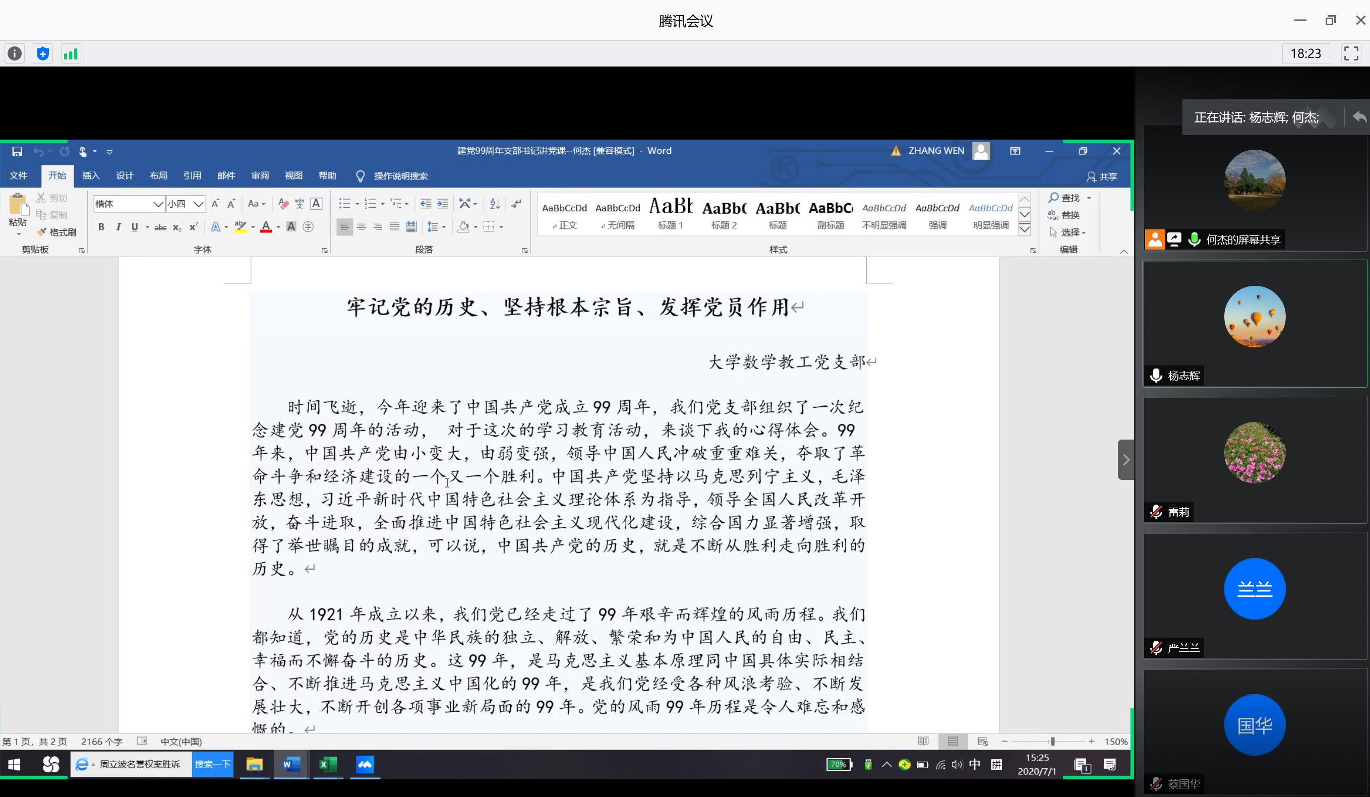 大学数学部教工党支部书记何杰以《牢记党的历史、坚持根本宗旨、发挥党员作用》为题,通过腾讯会议为大学数学部全体教工党员上了一堂党课,号召系全体教师要在新时代教育事业中发挥先锋模范作用,牢记党的历史,在自己的岗位上做出一番成绩,为实现民族复兴伟业奉献自己的力量。