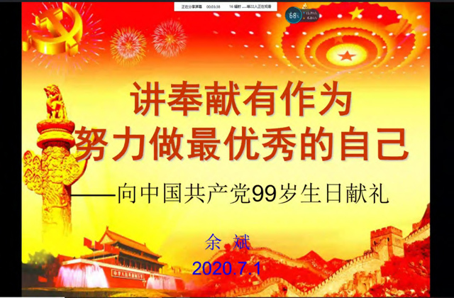 根据学校《关于开展纪念建党九十九周年“三级书记”讲党课活动的通知》要求,2020年7月1日下午,核科学与工程学院党委书记余斌为辐射与核化工联合学生党支部全体党员上了题为“讲奉献有作为 努力做最优秀的自己”的微党课。