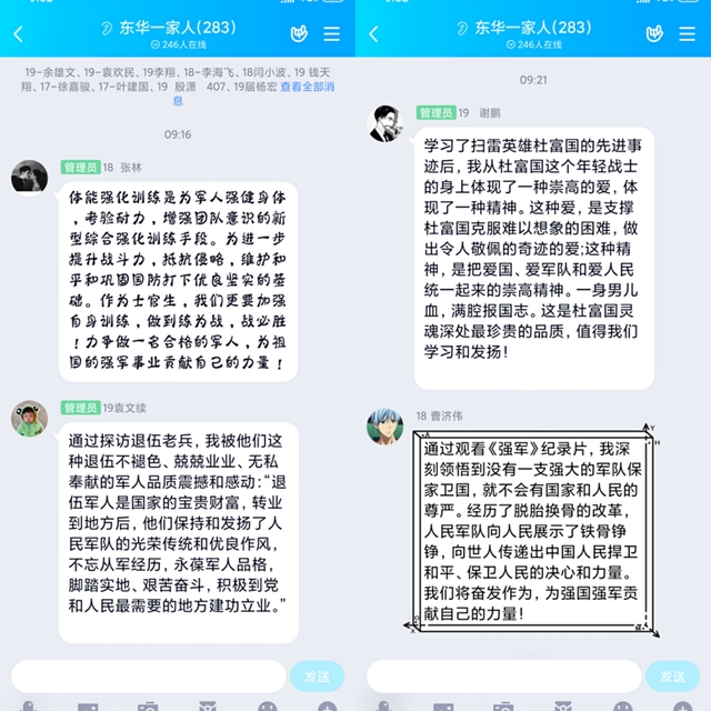 通过探访退伍老兵,19级定向培养士官袁文续被他们这种退伍不褪色、兢兢业业、无私奉献的军人品质震撼和感动:“退伍军人是国家的宝贵财富,转业到地方后,他们保持和发扬了人民军队的光荣传统和优良作风,不忘从军经历,永葆军人品格,脚踏实地、艰苦奋斗,积极到党和人民最需要的地方建功立业。”