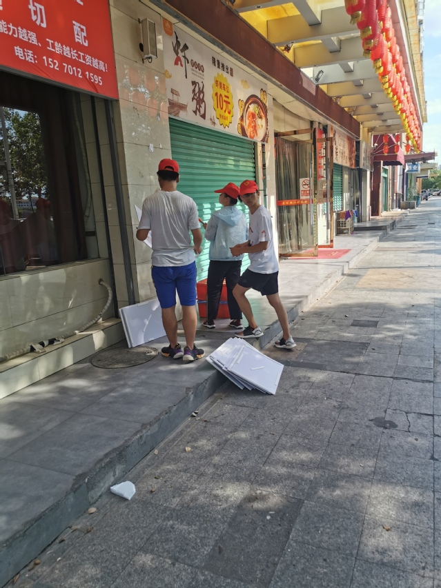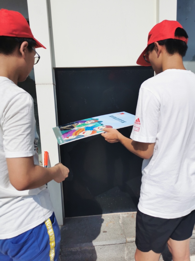 7月23日,志愿者们出发前往赣州市章贡区肖园里社区服务站开展社区服务活动。烈日当空,同学们不畏酷暑,将社区告示牌上的小广告小心仔细地铲下,不放过任何一处角落。待告示牌恢复原貌,同学们再将文明标语粘贴在告示牌上。奋战一天后,社区各个地方的告示牌均已贴上文明标语。