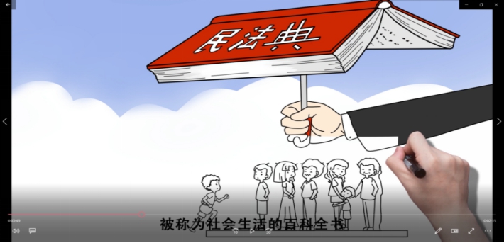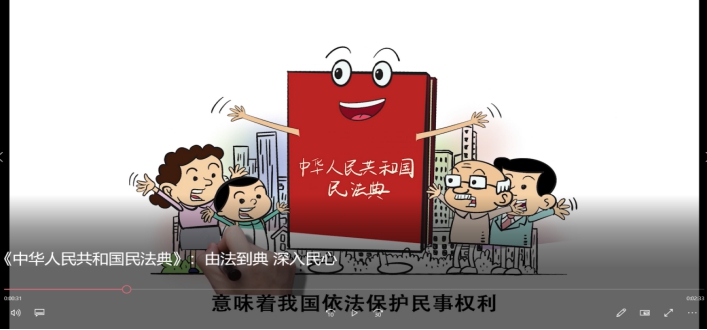 一只手,一把“伞”,“伞”下站着形形色色的人们洋溢着幸福的笑容。这是由文法学子独立制作的普法系列手绘视频之民法典篇——《中华人民共和国民法典》:由法到典,深入民心,视频把民法典拟人化,利用短短几分钟便将民法典中青少年家庭保护、社区保护、赡养老人、网络安全等四个方面的内容做了详细描述,诠释了民法典对百姓的重要性。