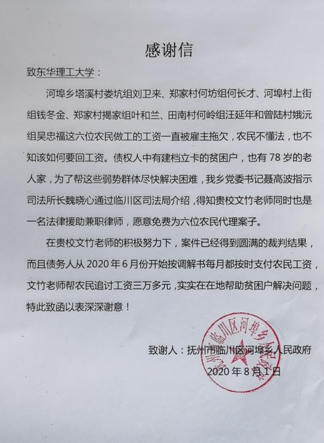 基层是思政法律教育的丰饶沃土,也是思政法律服务的短板。为了向学生讲授带泥土气息的思政法学知识,师范学院注重发挥学院特长,积极为基层提供思政法学咨询服务。2020年3月,学院接到临川区河埠乡司法所电话,反映河埠乡塔溪村等村共六位农民被拖欠工资数万元,债务人逃避债务无迹可寻,农民工求助无门。