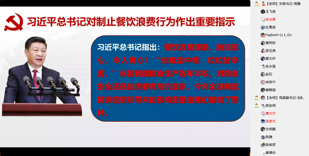 为深入贯彻落实习近平总书记对制止餐饮浪费行为作出的重要指示精神,弘扬和践行社会主义核心价值观,倡导勤俭节约之风和绿色低碳生活,8月28日,核科学与工程学院核工专业学生党支部在线开展“拒绝舌尖上的浪费”主题党日活动,支部全体党员参加活动。活动由党支部书记周勇主持。
